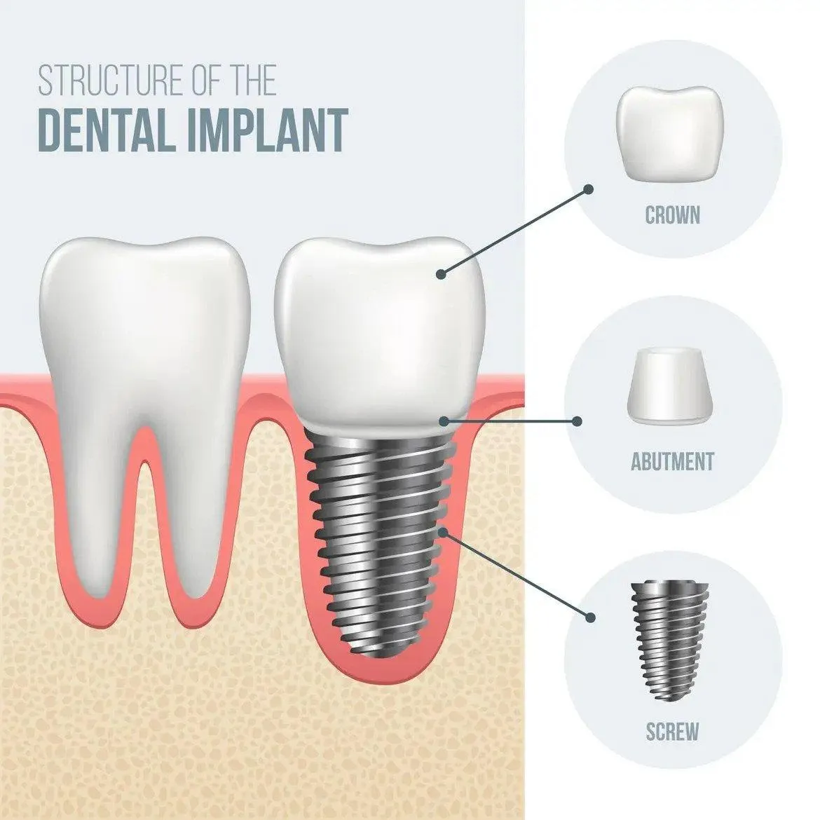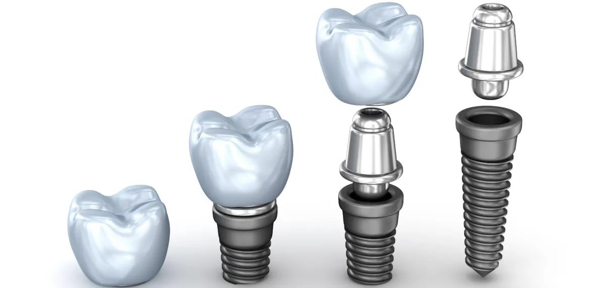 Dental implants typically have three parts - the implant, the abutment & the crown. The implant is made of medical-grade titanium.