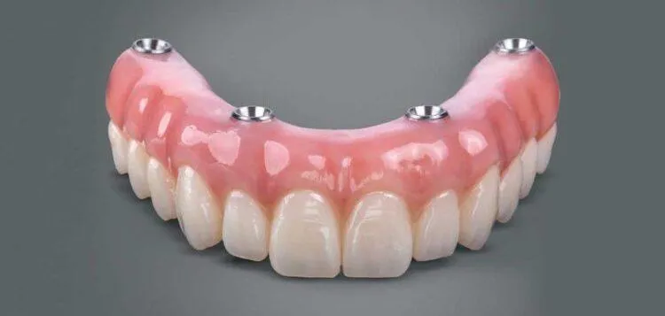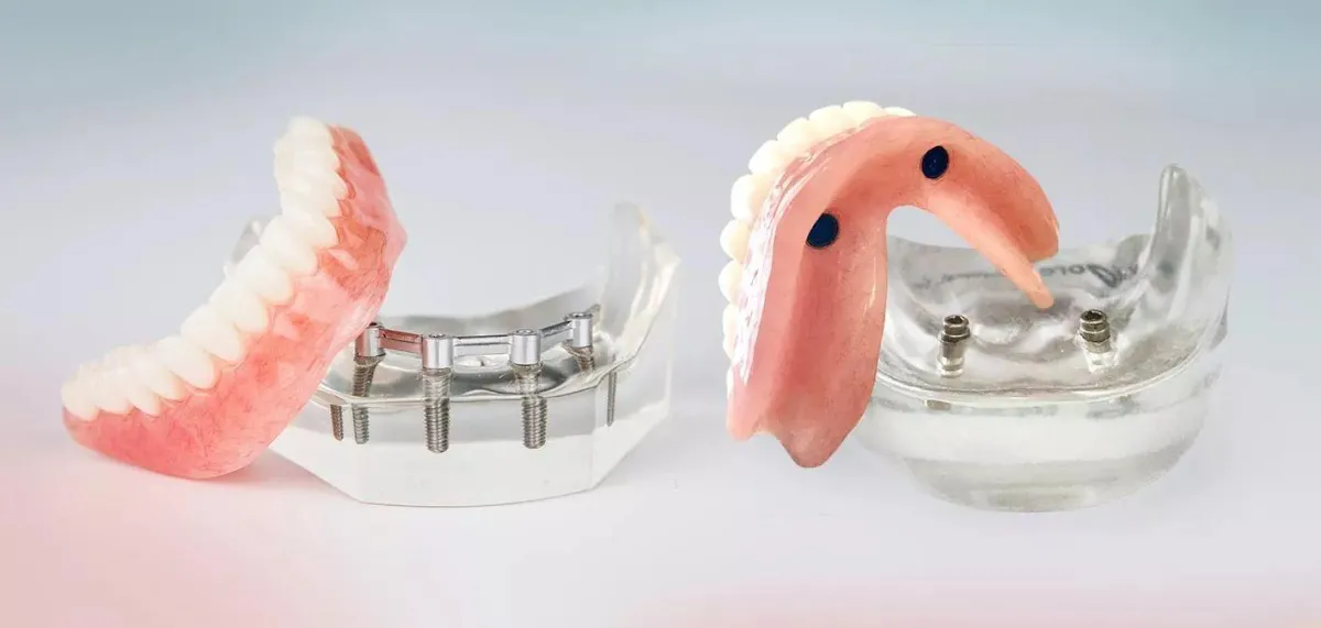 This might look like a regular denture, but it is anything but that. These dentures snap in place on top of dental implants. This means they prevent bone loss and give you around 80% of your biting force back. With these, you can eat food with ease, and you'll never have to worry about them falling out.